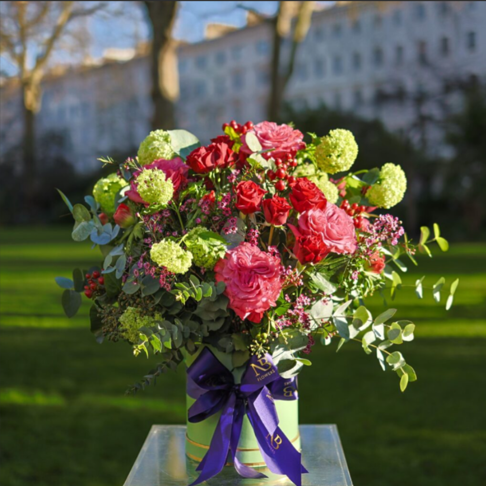 A beautiful mixed bouquet of flowers including red and pink roses with complimenting seasonal foliage to ensure they are yours forever.