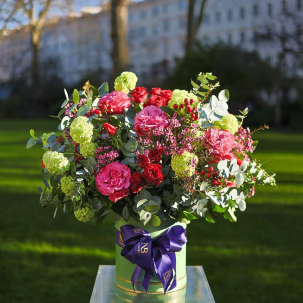 An indulgent mixed bouquet of flowers including red and pink roses with complimenting seasonal foliage to confirm your eternal love.
