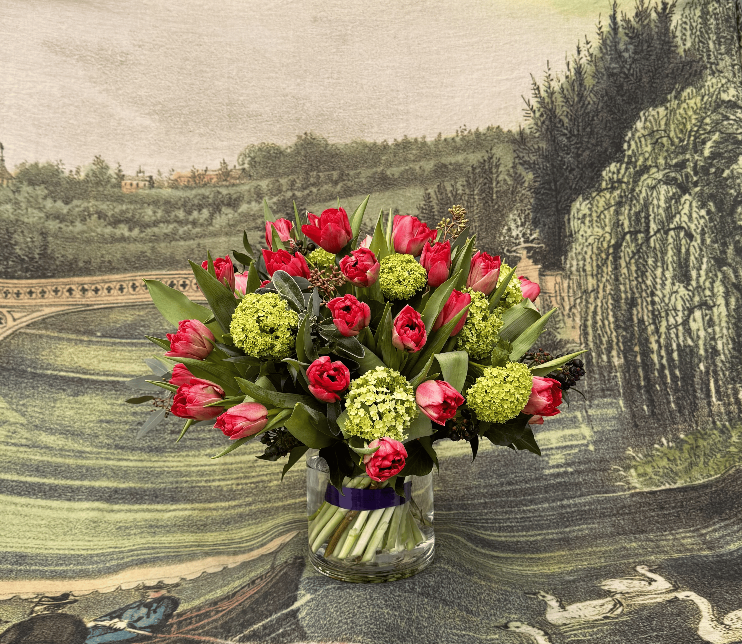 A smart glass cylinder featuring elegant red tulips and seasonal foliages to treat and indulge your hearts desire.